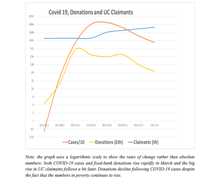 As the health crisis peaked, so did donations. The uncomfortable news, however, is that support tailed off just as the number of COVID-19 cases declined from April onwards, even though the numbers in need of support continued to rise. This indicates that public generosity is a response to the impact of the pandemic and the feeling that "we're all in this together" rather than to the needs of those who lost their jobs.